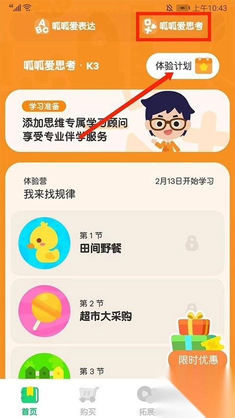 2、选择“呱呱爱思考”栏目下的“体验计划”选项,
