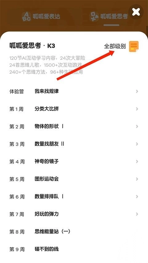 3、进入呱呱爱思考界面,选择右边“全部级别”选项,