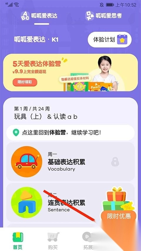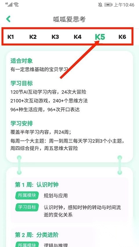 1. 点开叽里呱啦app,挑选要切换级别的类别,其分为“呱呱爱表达”与“呱呱爱思考”,在此以“呱呱爱思考”来说明。