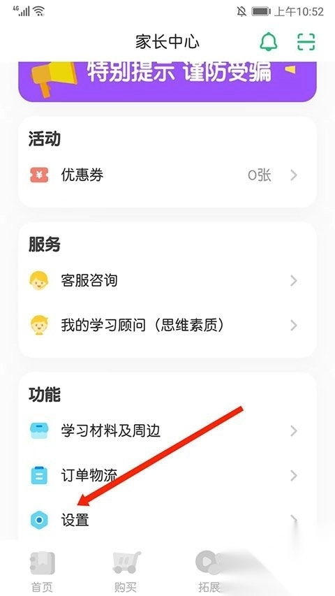 2. 进入家长中心页面,向下滑动,选中“设置”这一选项。