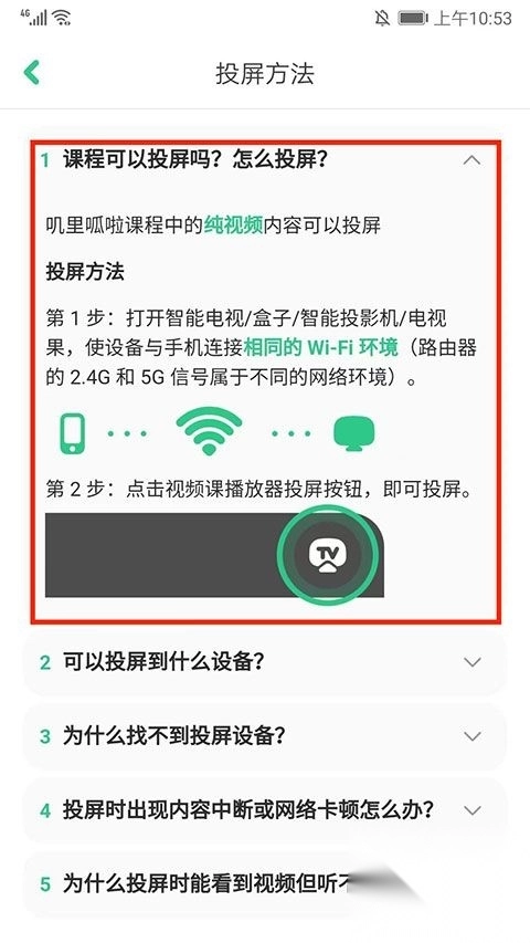 4、进入投屏方法界面,选择第一个,首先打开智能电视/盒子/智能投影机/电视果,使设备与手机连接相同的WI-FI环境,然后点击视频课播放器投屏按钮,即可投屏。