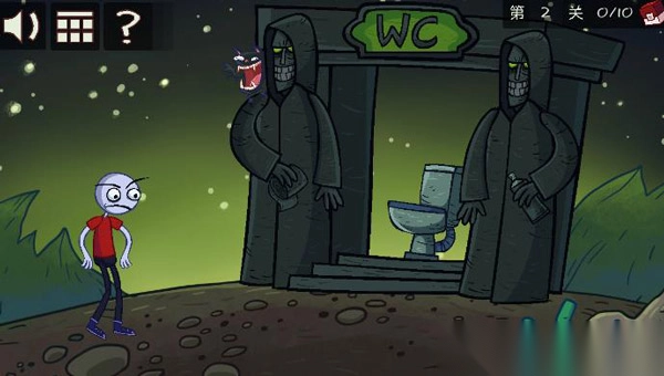 操作指引:点击右侧的“喷雾恶魔”,随后清除气体障碍,接着点击厕所,最后小人就会坐下。