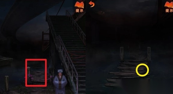 1、在码头场景,先点击左侧红框标记的木板区域,再互动右侧黄圈标注的物品,收集关键道具推进流程。