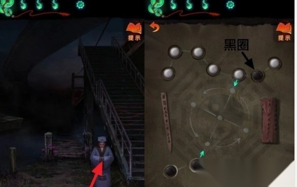 1. 黑圈机关:在右侧的机关图里,黑圈作为核心节点,要依据绿色箭头的指引与白圈进行连接,从而形成回路(按照箭头所指的节点先后顺序),这或许与签文“示运之物固关己”的布局暗示相契合。