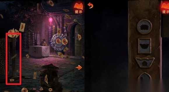 3、点击左侧红框的木架获取线索,依据线索匹配右侧机关的图案(莲花、碗等形状),解锁新区域。