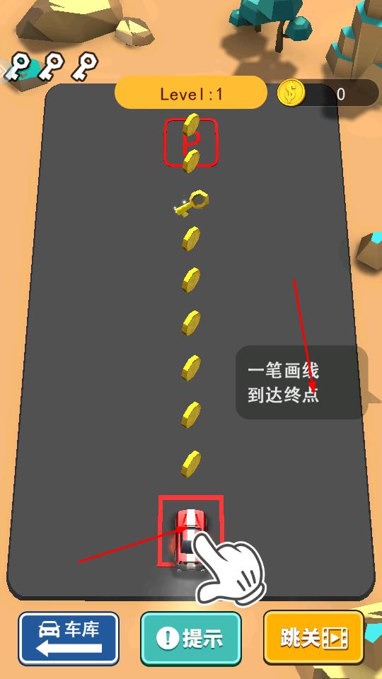 2. 根据一笔画线抵达终点的提示,从汽车所处位置开始画线,连接至P停车点,途中收集金币和钥匙,完成核心操作。