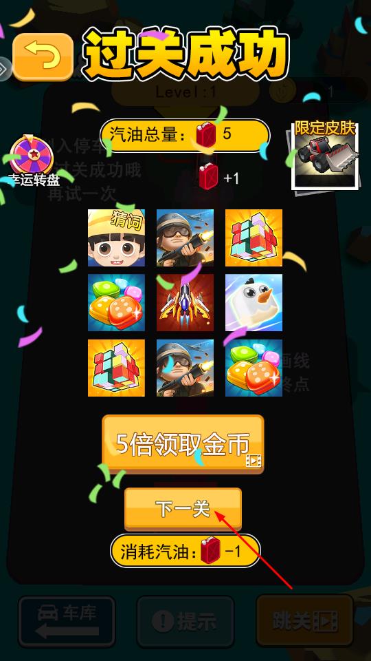 3、成功过关后,你可以选择以5倍的数量领取金币,或者直接点击进入下一关。持续消耗汽油,就能推动游戏进程。