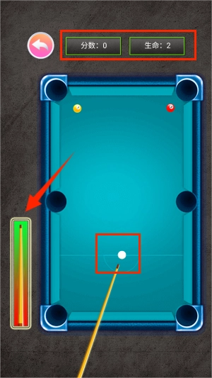 2、在最上方能看到分数以及你的生命值。你得先瞄准,接着射击白球,从而把桌面上其余的球打进洞内。
