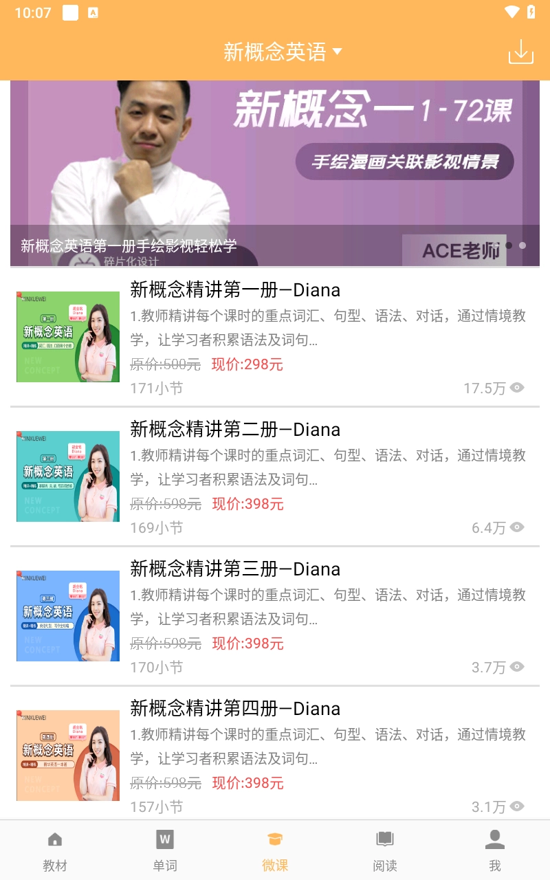3、在此处,为用户准备了丰富多样的英语微课,涵盖新概念英语、四六级、VOA英语、考研英语、托福等各类课程。
