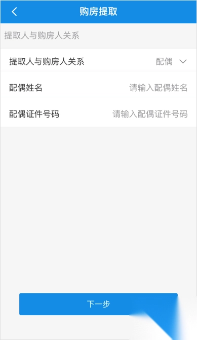 2、点击【我已阅读并接受】后进入办理业务页面,根据实际情况选择提取人与购房人关系:若您本人提取,则如下图左所示,若您配偶提取,则需要填写配偶姓名及配偶证件号码,如下图右所示。