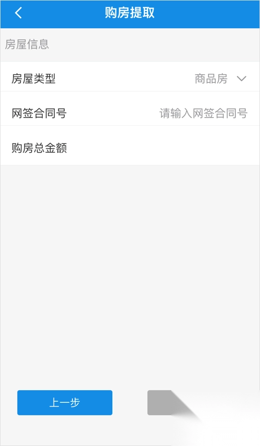 3、选择好婚姻况后,点击【下一步】,进入房屋信息页面,根据实际选择、填写【房屋类型、网签合同号】后,购房总金额将自动反显。