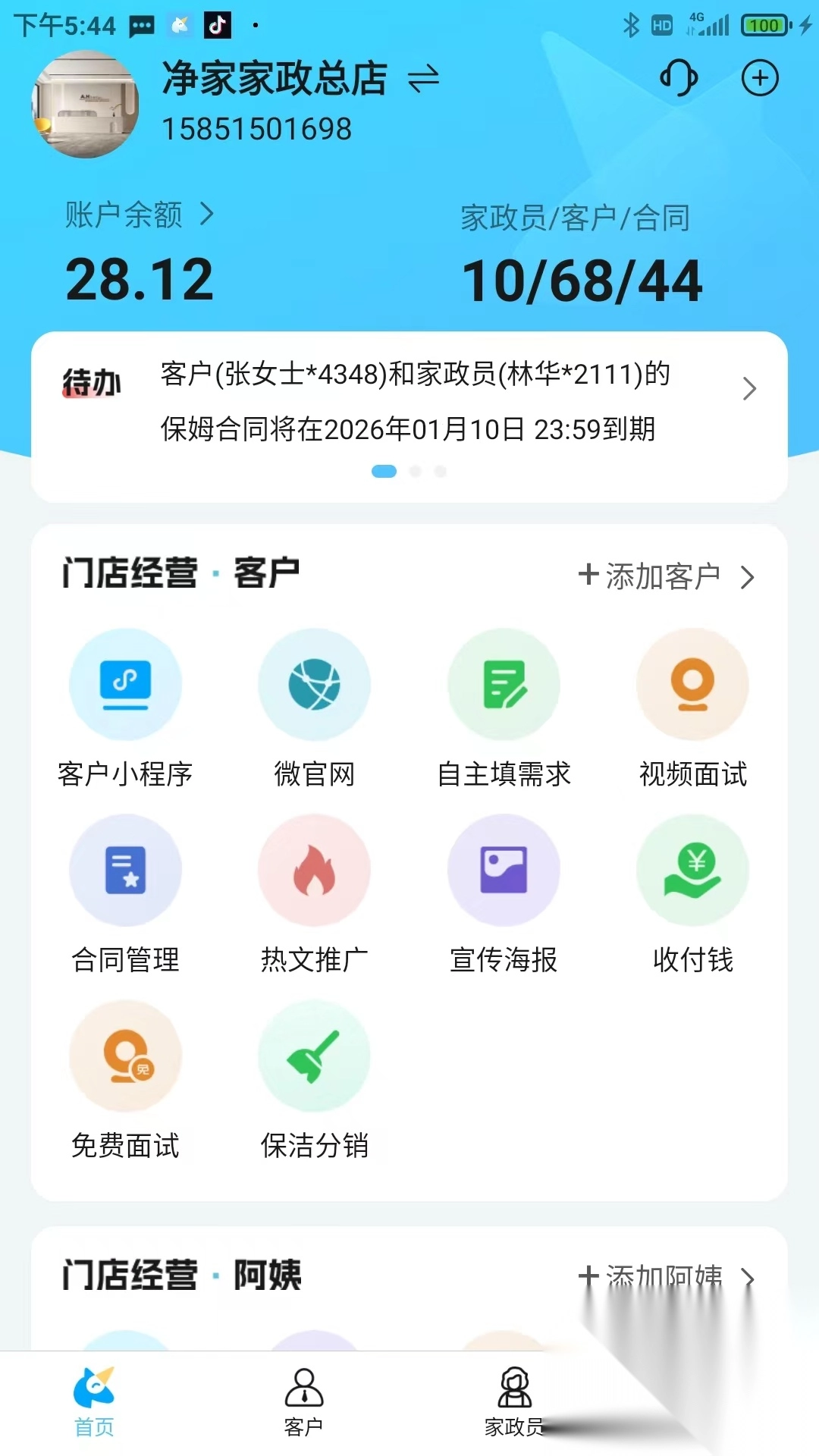 1、在首页,您能够直接看到账户余额,同时了解到目前在职的家政人员数量、客户数量以及已签订的合同数量。此外,还具备支持面试阿姨的功能,无论是视频面试还是语音面试都能实现,功能相当齐全。