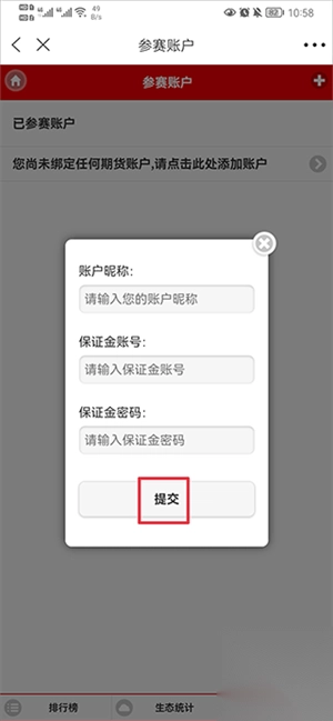 5、设置参赛昵称,添加保证金监控中心账号密码(可添加多个保证金账户)。
