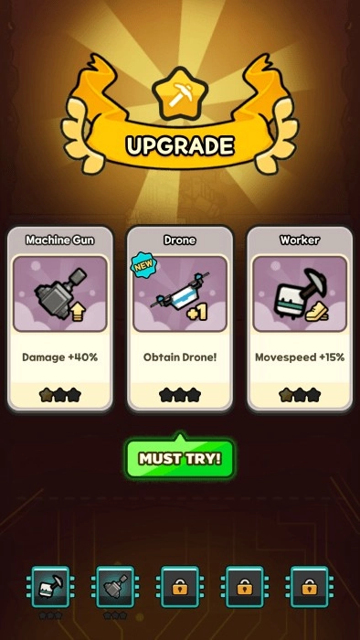 3、进入【UPGRADE】界面,根据自身需求挑选【Machine - Gun】增伤、【Drone】获取无人机或【Worker】加速选项,点击升级,使自身实力进一步提升。
