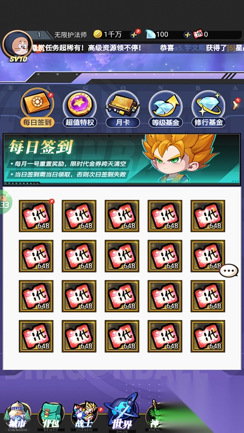 6、勇闯关卡,豪气送出千次抽奖奖励,还有各类界王神装备免费相赠,全力助力你争夺全服第一宝座。