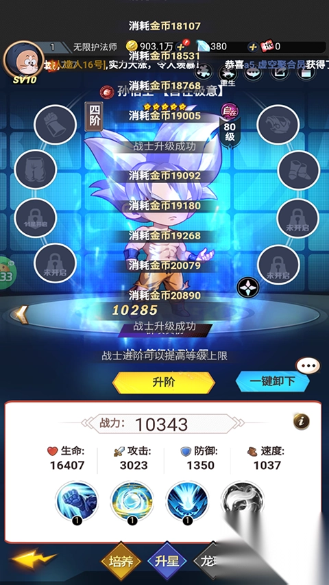 超级雷电战神是一款以七龙珠为题材精心打造的卡牌放置手游。游戏中对原著里众多角色进行了完美复刻,其中有孙悟空的多种形态,还涵盖同人设定的白神悟空与黑悟空形态,另外像破坏神比鲁斯、天使维斯,以及天生的超级赛亚人布罗利也都在列。玩家能够通过游戏内的抽奖免费获得这些角色。
