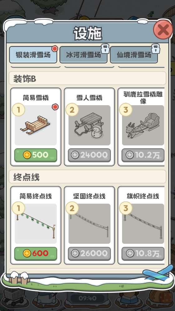 3.需要完成各种任务,解锁新的设施和服务,提升滑雪场的竞争力。