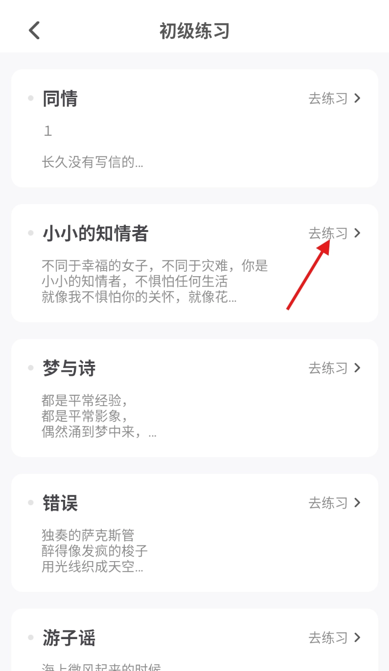3、在选定的练习类型页面,会展示多篇不同的文章,从中选择一篇点击开始练习。