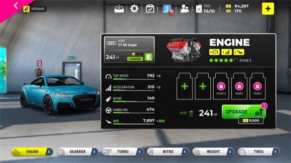 4、车辆的引擎、操控、涡轮、喷气、速度、轮胎皆可升级,升级需耗费金币。