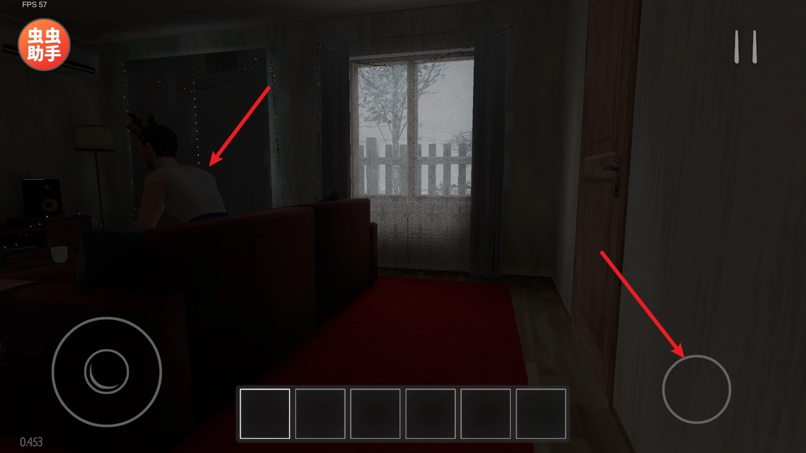 1、在游戏里,我们的目标是逃离家门。首先来熟悉一下操作,屏幕左侧的摇杆能够操控角色移动,而拖动屏幕就可以转换视角。