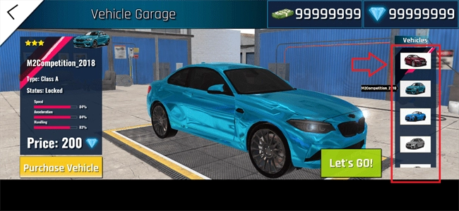 2. 来到汽车选择界面,在右侧找出感兴趣的车型,点击就能完成更换。选择好之后,点击“Let's GO!”