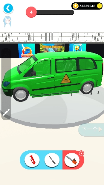 2、每一关卡都有无数的汽车,你可以用手中的道具一步一步地砸碎它们。