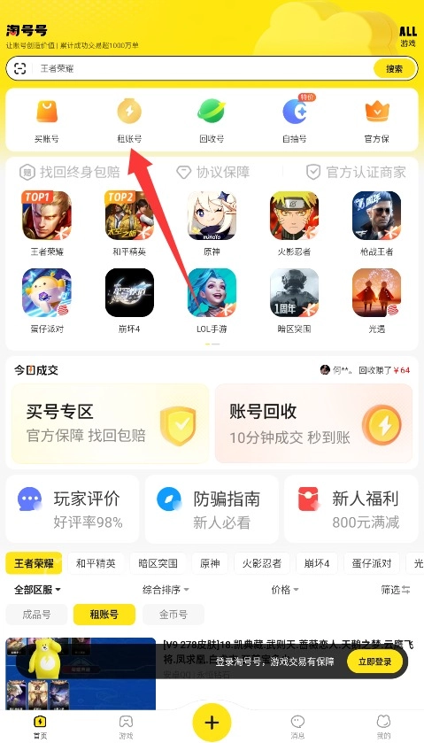 3、打开应用首页,点击顶部"租账号"功能入口,即可查看可出租账号列表并进行操作。