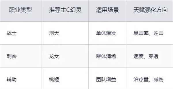 必备幻灵:高单体爆发(如刑天)治疗(如桃姬)。