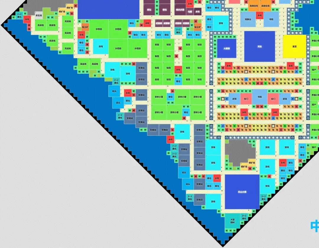 在布局图使用初期,按原布局即可。等住宅达到满级后,可将辅助建筑全部拆除,以此腾出人口用于练兵,这便是后期的布局思路。通常情况下,除了住宅(保留人口容纳量)、商铺(用于收税)、四防建筑(防止城市倒塌)、皇宫(保留主权象征)、奇迹建筑(保留编制相关作用)、鱼塘和矿区(用于收集物资)之外,其他建筑都能够拆除。