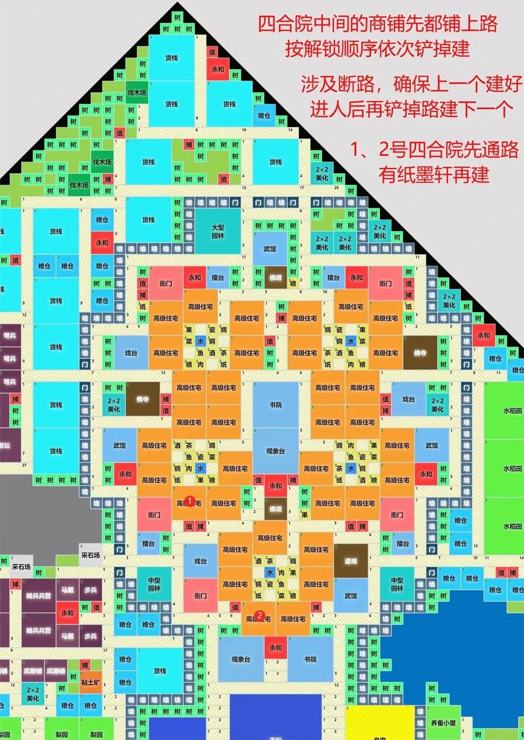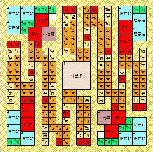 彩色的2×2、3×3或者4×4的格子(特别说明,5×5的格子指的是华夏稻田)。只要是和布局图上彩色格子面积大小一样的建筑,在有四防跟随的情况下,想建在这些格子中的任意一个里面都没问题。