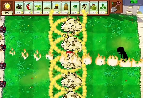 2、火爆辣椒:除了释放原本的火焰,还会让该列引发土豆雷爆炸,过程中伴有星星出现。片刻之后,会再度展现出两排辣椒的效果。
