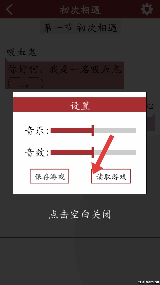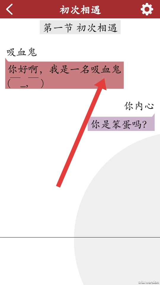1、点击开始游戏,进入初次相遇章节,阅读吸血鬼与你的对话,推进了剧情,触发了互动的选择。