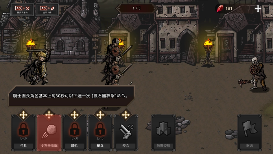 3、技能发动方式:点击兵种卡牌,可触发突击,也能够释放骑士团长的投石攻击。