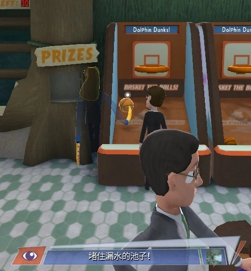 11、落水桶游戏:拿那个男人的篮球堵住玻璃漏洞。