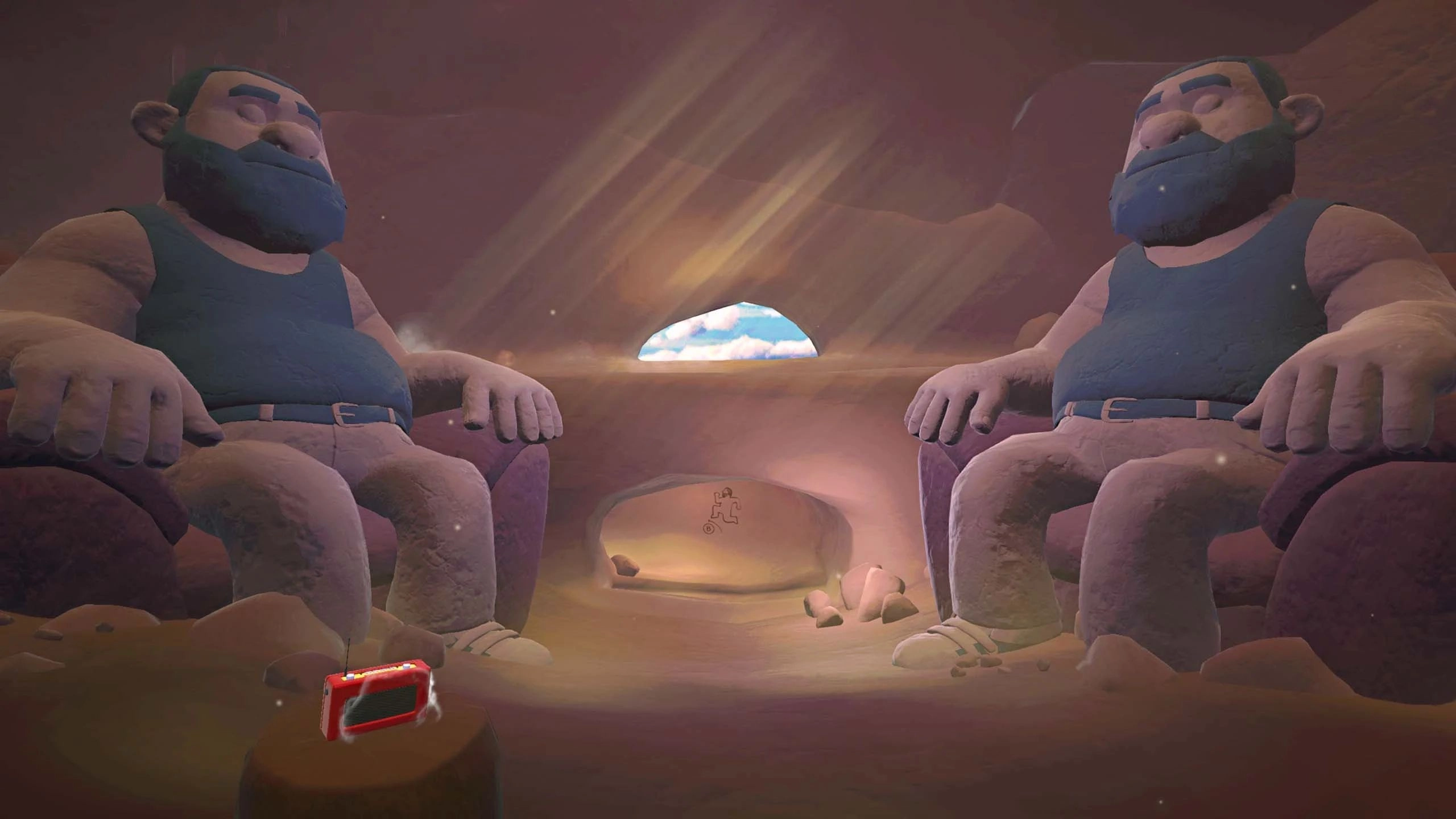 玩家捡到枪后转身往回走,来到巨龙身旁,在巨龙的背上打出一个洞,从而穿过龙的身体。接着,玩家寻找一个高台,先对着墙壁开一枪,再对着地面开一枪,随后穿过传送门进入高台。等玩家到达高台后,只需朝着标有X的墙壁开一枪,按下按钮,然后朝着传送门冲过去,静静等待大叔醒来,就能通关了。