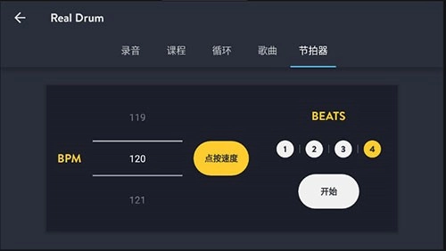 2、点击左上角黄色的按钮,进入节拍器界面,可自行设置;