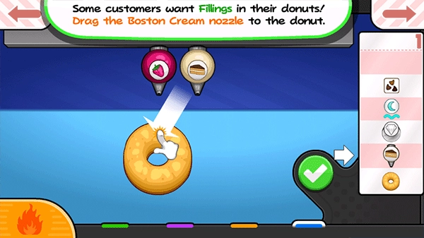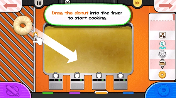 这一步相当关键,玩家的甜甜圈必须经过油炸才能出炉。判断油炸程度,可观察炉子中的计量槽,计量槽颜色越深,甜甜圈颜色越趋近深色,就意味着越接近完成状态。特别要注意的是,甜甜圈有两面,必须两面都炸到。此外,千万记住油炸时间不能过长。