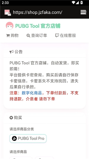 2、初次使用的小伙伴需购买卡密,点击后跳转到外部页面,进入pubgtool官方店铺。