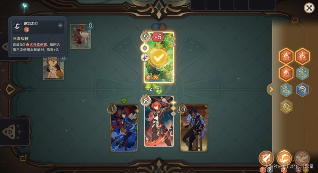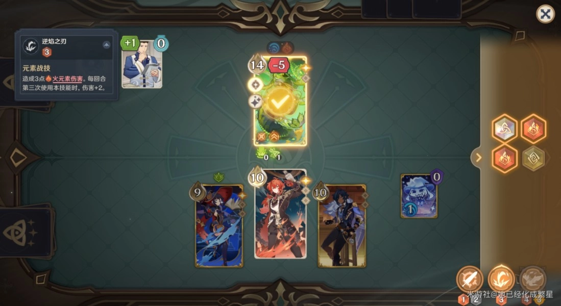 3、能量管理方面:技能所消耗的是对应的元素骰(像水、火之类)。在战斗开始前,需挑选好角色,在回合之中,要优先凑齐足够数量的元素骰,以便释放关键技能。