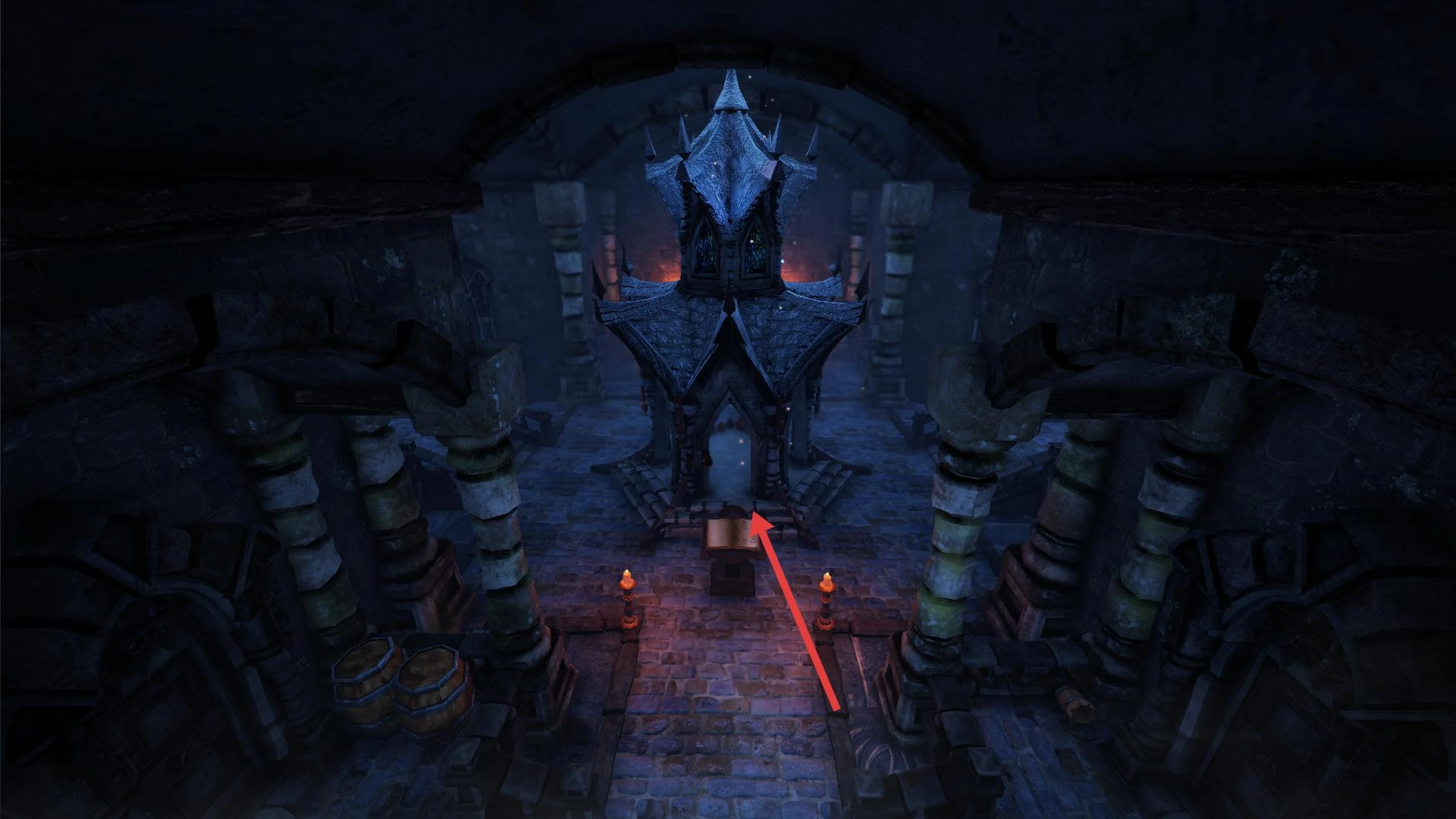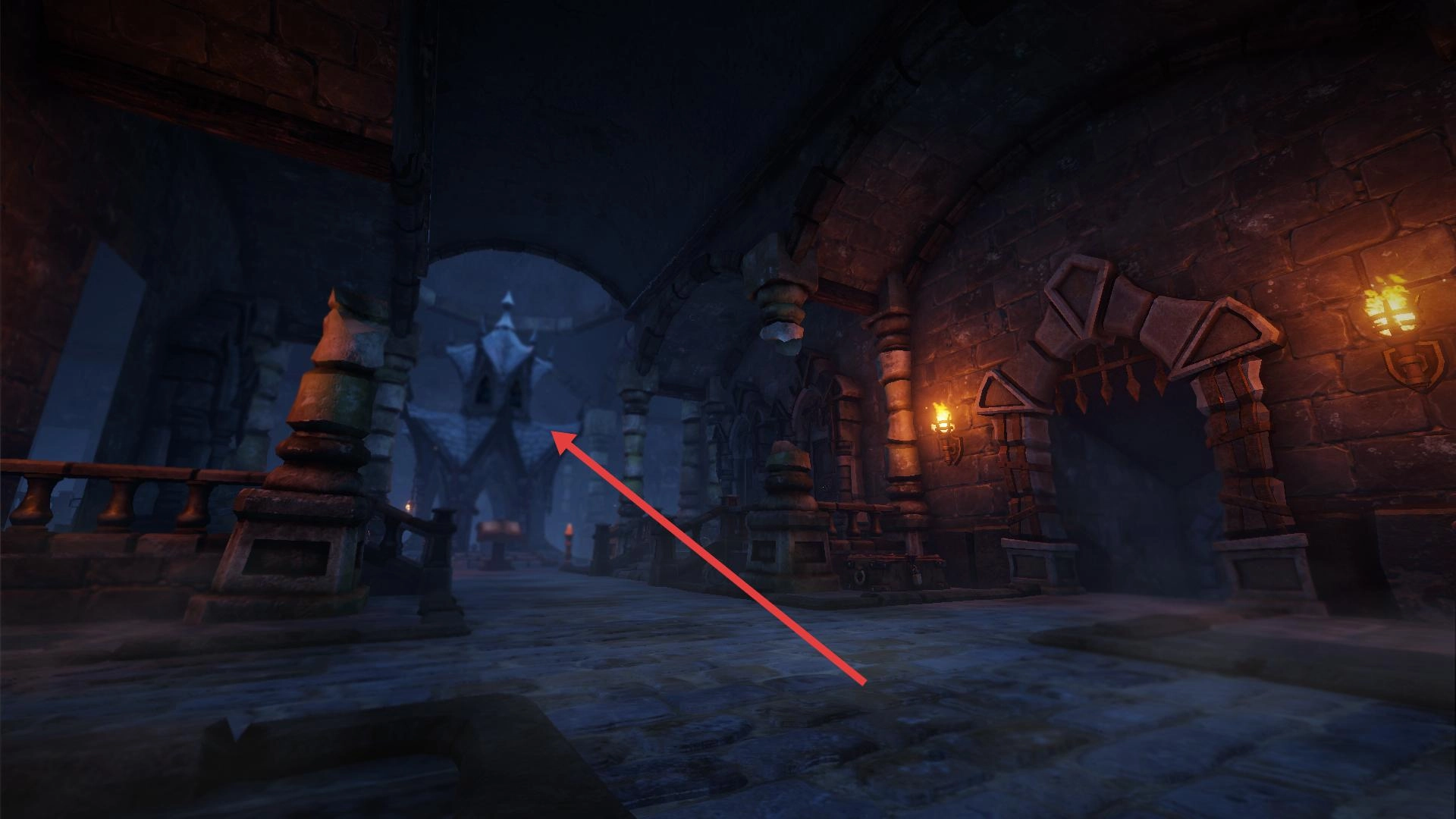 2、进入大厅,前往箭头指向的中央建筑,调查交互,开启新区域或解锁道具。