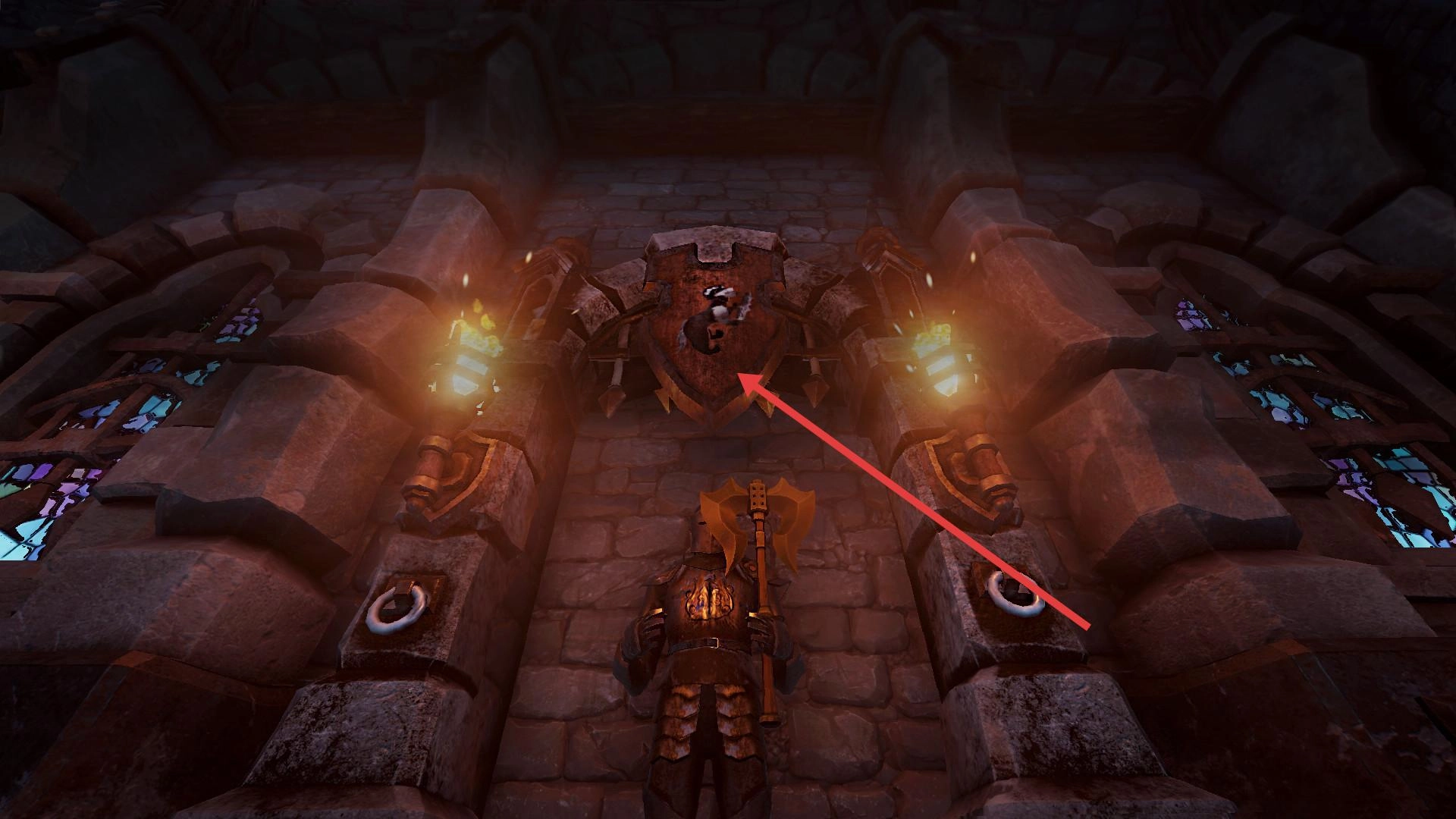 1、初始场景,靠近并互动箭头指向的盾牌浮雕,触发解谜或剧情,获取关键线索。