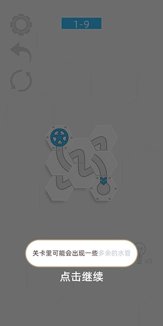 1. 用户进入六边形接水管后,能够选择“继续游戏”,从而从上次中断的关卡处接着游玩。