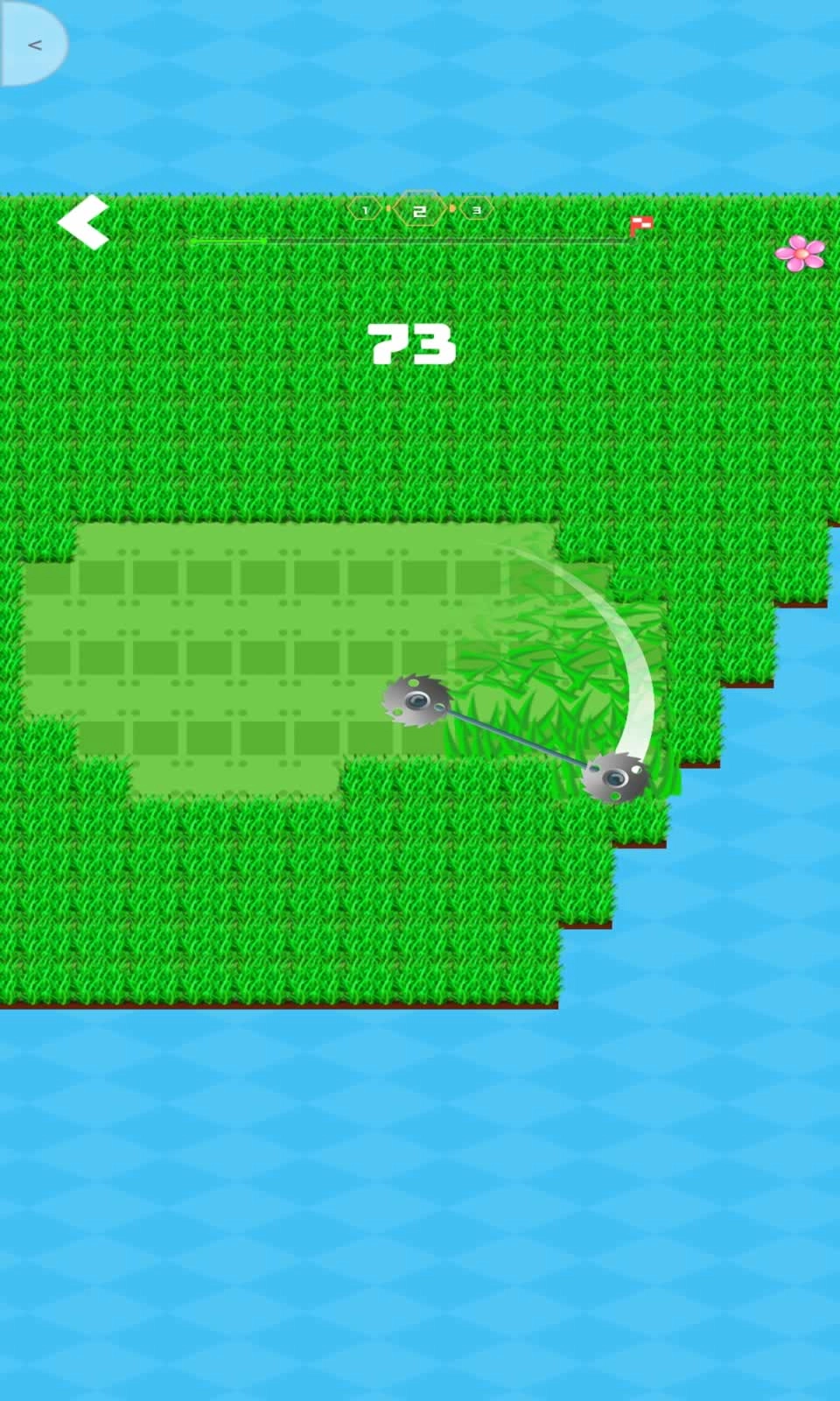 通过单指滑动,可操控橙色割草机做转圈移动。游戏过程中,蓝色圆心务必始终维持在绿色草地的范围之内。而外围的圆环,会对经过的草叶进行切割。