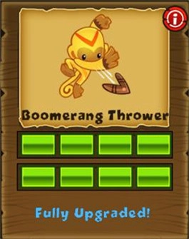 回旋镖猴,在《射气球》游戏里技能可见一斑。弧线式攻击,射速一般,回旋镖开始的时侯连续攻击3个气球后消失。