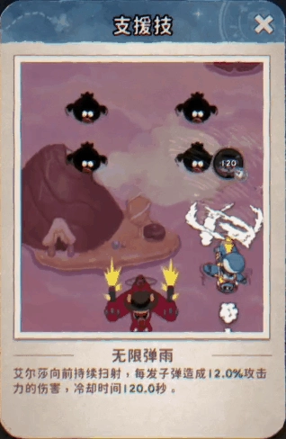 羁绊支援(艾尔莎):【无限弹雨】- 艾尔莎向前进行狂风暴雨般的持续扫射,对前方区域的敌人造成密集的连续伤害! 弹幕倾泻,火力压制!