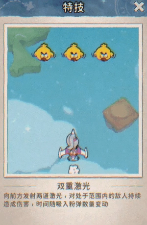 特技:【双重激光】 - 向前方发射两道持续激光,对范围内的敌人造成持续伤害,吸入的粉色弹幕越多,激光持续时间越长!
