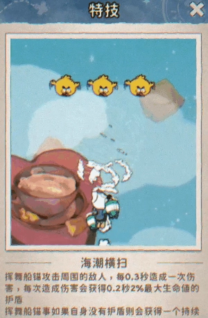 特技:【海潮横扫】——挥动船锚对周边敌人展开攻击,每次攻击都能叠加护盾。若挥动船锚之际自身尚无护盾,便会即刻迎来高额护盾爆发。持续挥动,持续庇佑;危急关头,巨浪守护!攻防兼备,掌控潮汐之力!