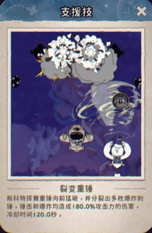 羁绊支援(斯科特):【裂变重锤】——斯科特奋力挥动巨大重锤,朝着前方迅猛砸下,同时分裂出数不清的爆炸性刺锤。无论是重锤直接砸击,还是分裂刺锤引发的爆炸,都能给予敌人毁灭性的重创!(冷却时间颇长,却能在关键之际扭转战局!)