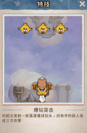 特技:【爆钻突击】 - 向前方发射高速直线钻头,钻头伤害高且具有穿透性,是快速突破敌人防线的利器!