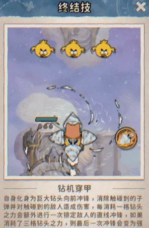 终结技:【钻机穿甲】——化身为巨大钻头,朝着前方迅猛冲锋,不仅能清除前进途中的子弹,还会对敌人造成伤害。在积攒钻头之力后,可实现多次锁定冲锋。当钻头之力达到三格时,最后一次冲锋将转变为强力形态!